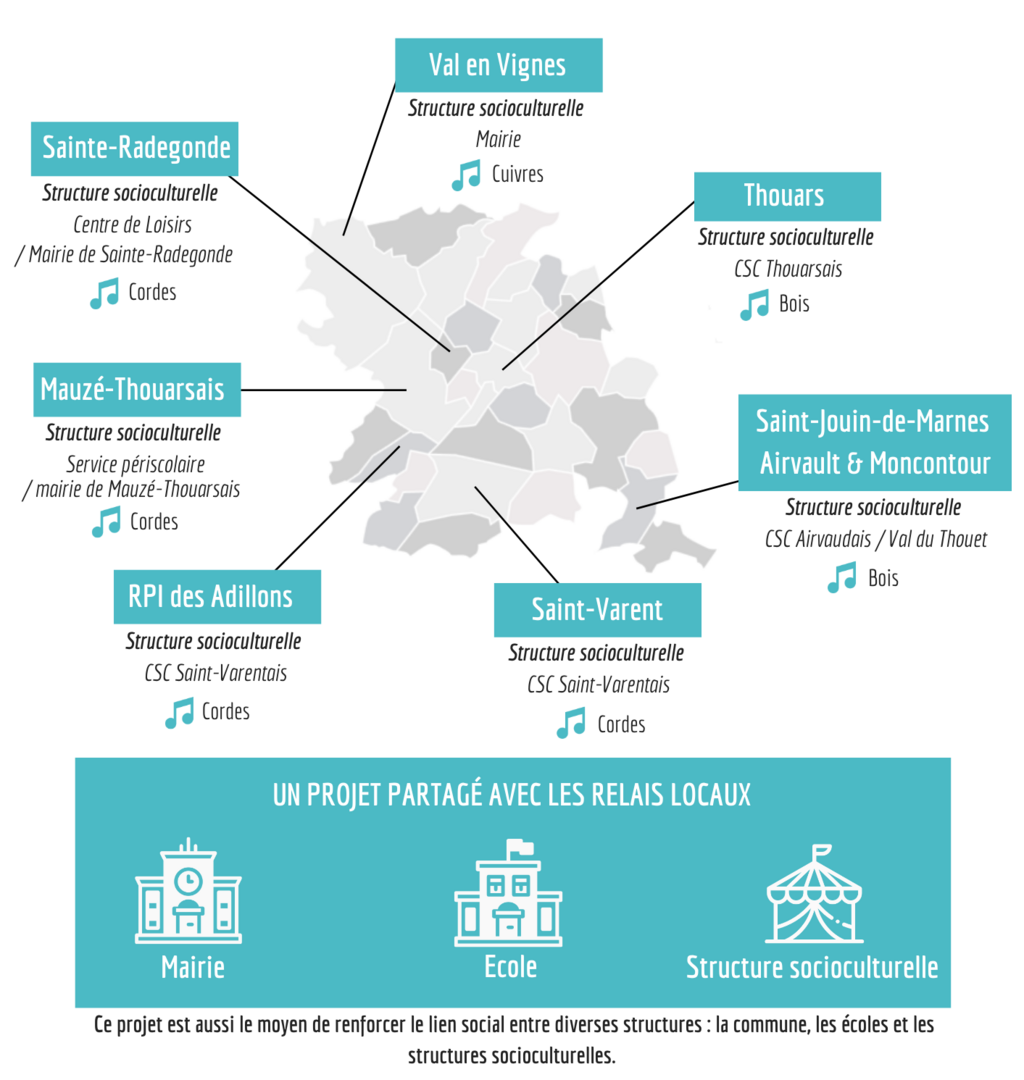 Le Pôle Culture / Conservatoire de musiques et de danses du Thouarsais a relevé le défi en partenariat avec les communes d'accueil et les structures socioculturelles. Pour le Thouarsais, plus petite collectivité participante au début du projet, cette opportunité représente un enjeu fort d'ouverture et d'accès à la culture dans le contexte social et rural du Thouarsais.